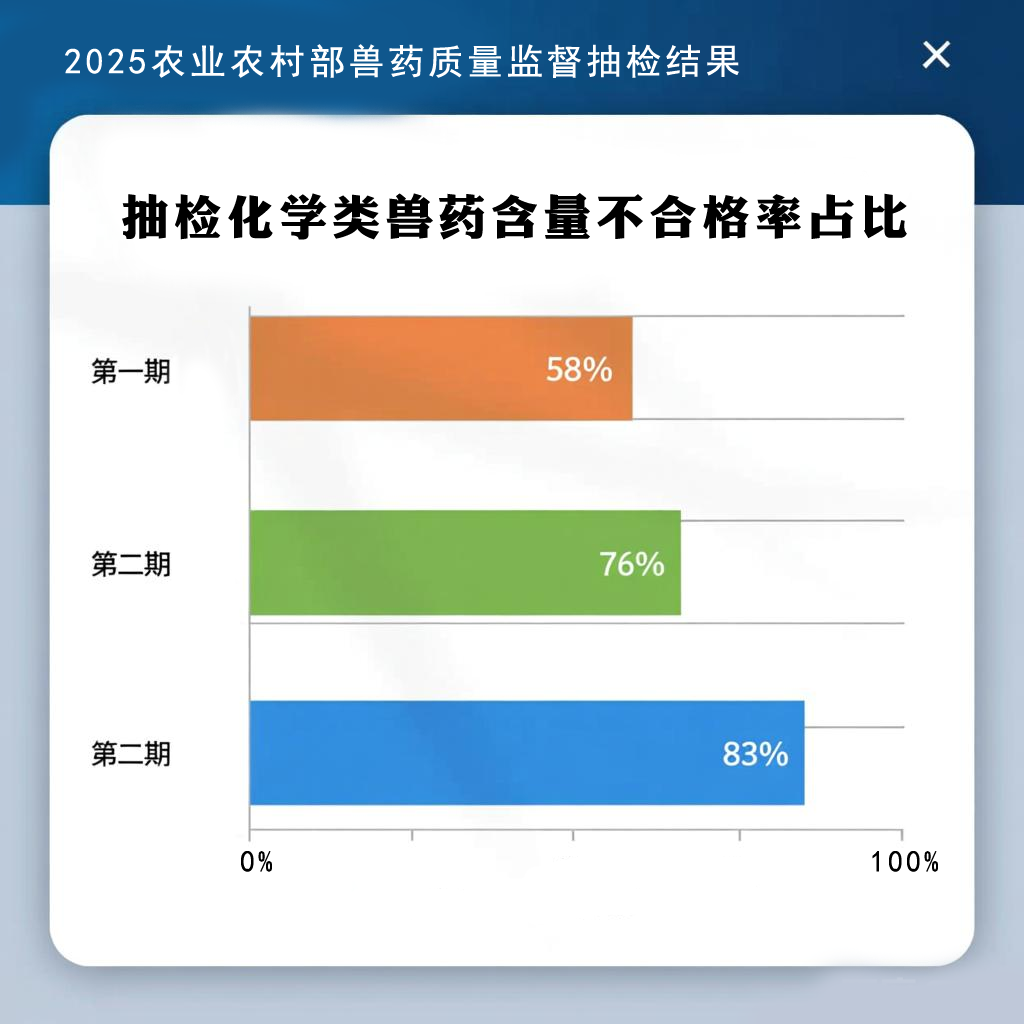 2025年,农业农村部发布的前三期兽药质量监督抽检通报,描绘出一幅令人震惊的行业现状:网络销售的兽药假货率已超过90%,部分品类造假率甚至达到100%。同时,化学类兽药的主药含量不合格率从年初的58%猛增至83%,假劣兽药正从线上蔓延至线下,从生产环节渗透到流通环节,全面侵蚀养殖业的根基。