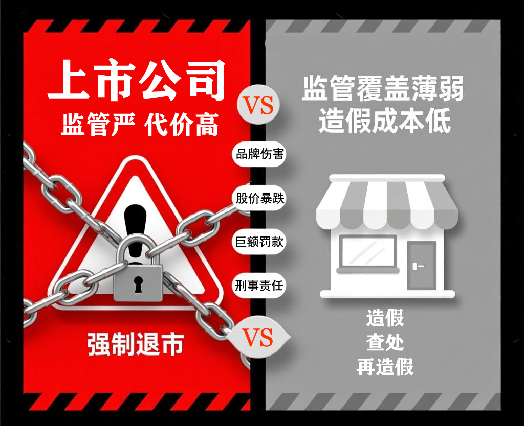 上市公司作为公众公司,其运营透明度和规范性要求更高,任何违规行为都可能被迅速放大并引发系统性风险,因此必须在合规框架内追求长期发展;而非上市主体由于缺乏持续的市场监督和严格的信息披露义务,更容易陷入“赚快钱”的短视行为,将造假作为降低成本、获取超额利润的捷径。