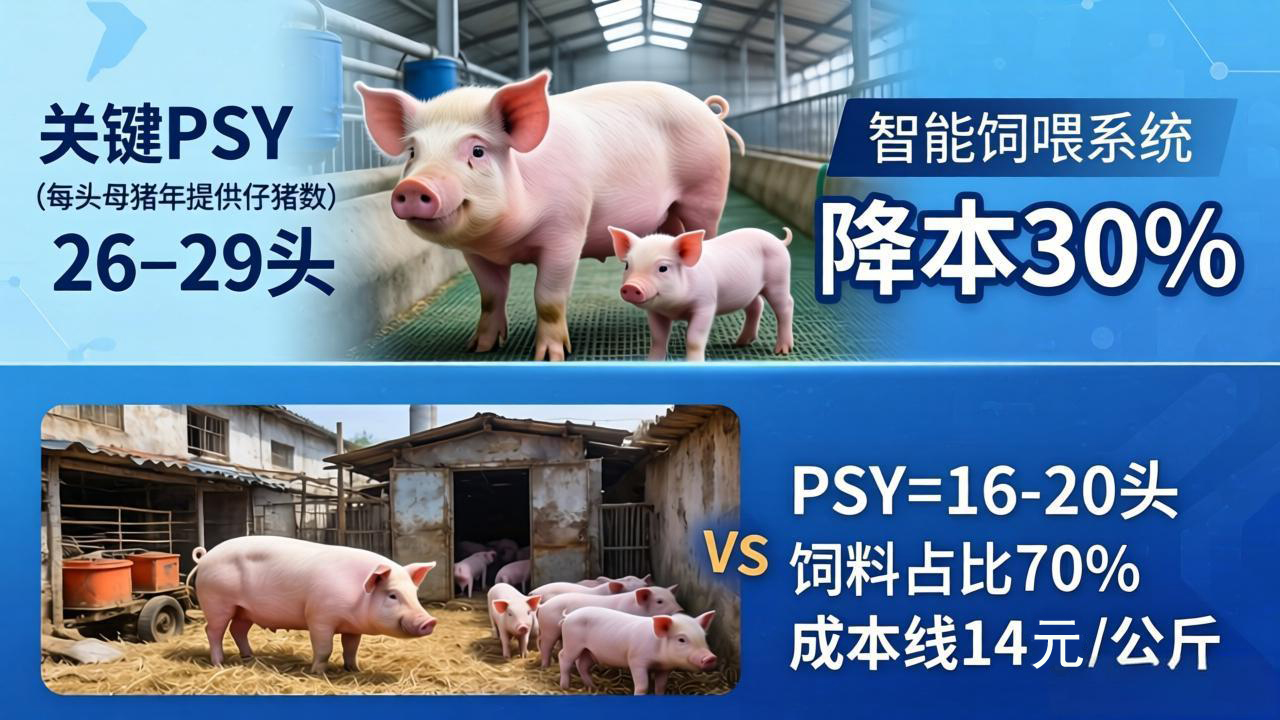 成本控制,首看PSY(Pigs Weaned per Sow per Year):每头母猪每年提供的断奶仔猪数,是衡量猪场繁殖效率与生产效益的核心指标。规模企业达26–29头,料肉比<2.5,智能饲喂降本30%。中小散户一般为16–20头,成本线突破14元/公斤,饲料占70%,无议价权。
